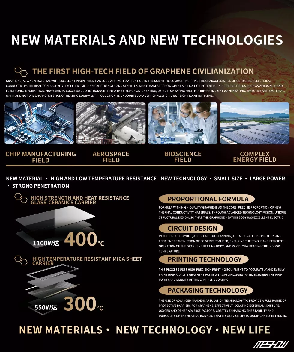 Meshow je močan dobavitelj, ki je uspešno razvil električni grelec belega belega grafena. Grafene grelec zagotavlja inteligentna, topla in udobna domača okolja za domače in tuje uporabnike, kar vodi nov trend ogrevanja doma in v tujini!